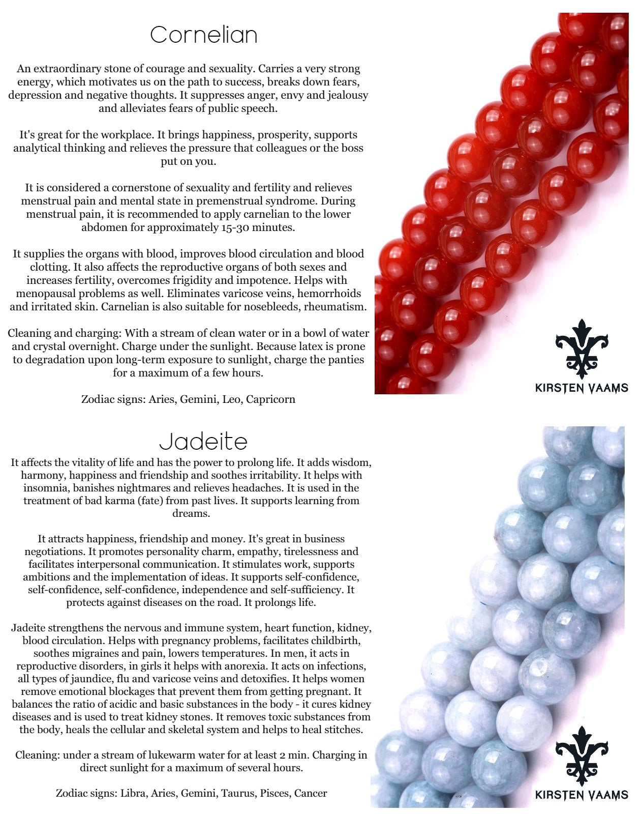 Stručné informace o všech kamenech a jejich nabíjení najdete v galerii ve dvou jazycích - v angličtině a češtině. Pokud toužíte po úplně jiném kameni, neváhejte mě kontaktovat. Ráda vám splním vaše vysněné kalhotky.
