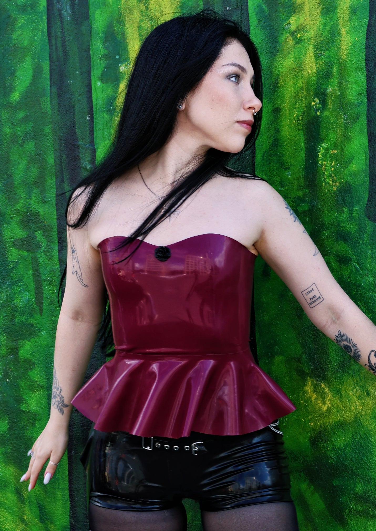 Whether styled with latex shorts, skirts, or tailored trousers, the "Amara" Latex Peplum Top creates an effortlessly chic look that’s perfect for parties, nights out, or elevated streetwear styling. Its glossy burgundy tone adds depth and allure, ensuring all eyes are on you.