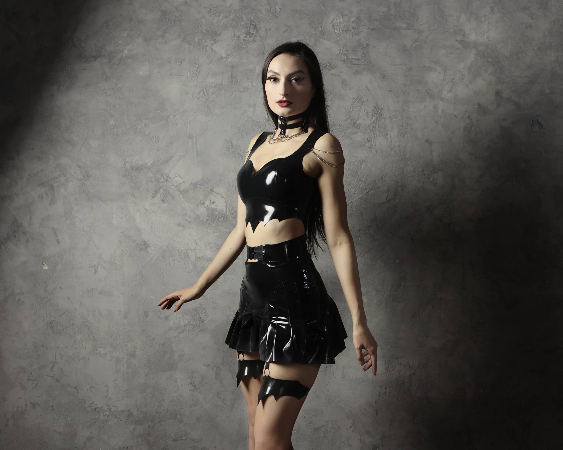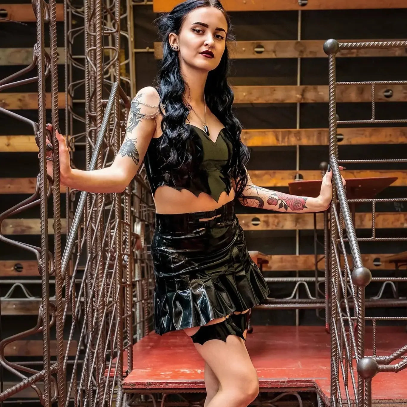 Introducing the "Elvira" pleated mini skirt, a bewitching fusion of dark elegance and playful charm. This uniquely designed skirt seamlessly marries the timeless allure of pleats with edgy plastic strap buckles and adds a touch of whimsy with adjustable leg garters that look like bat wings. Adorning your legs like mystical creatures, these garters add a touch of gothic fantasy to your look.