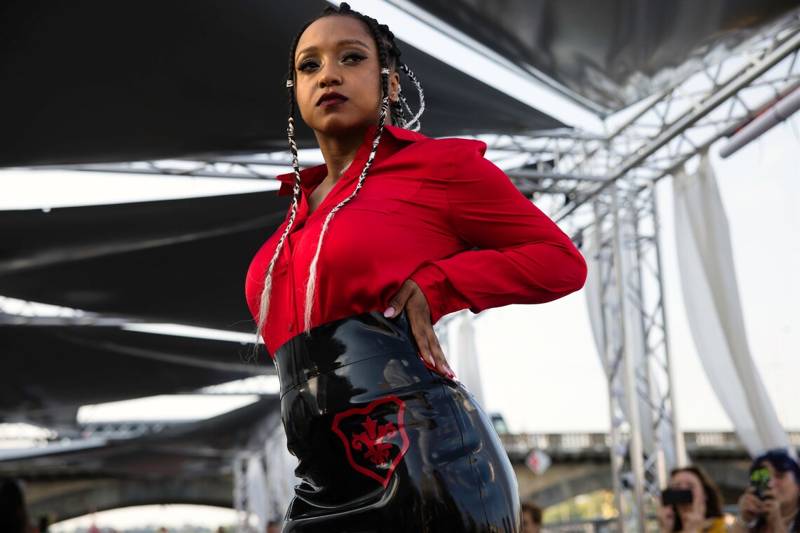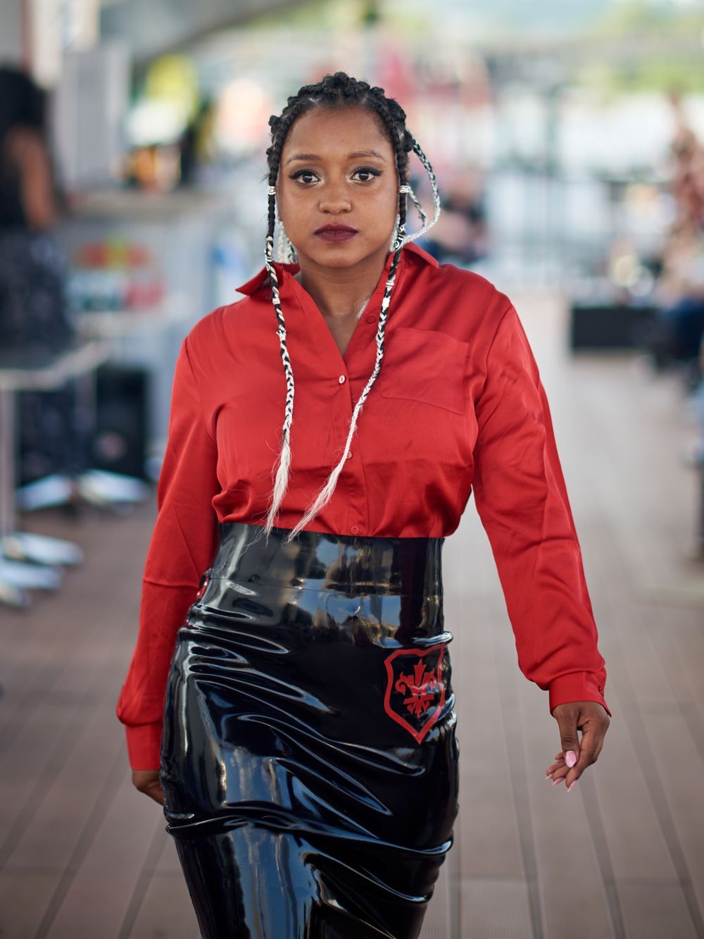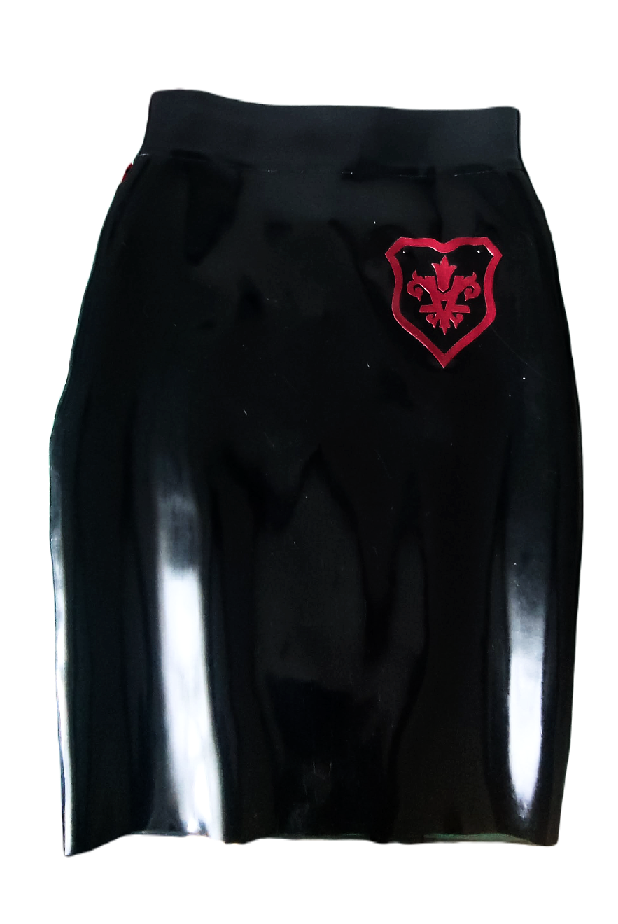 Black latex pencil skirt with red contrast color on the back lacing. The skirt fastens on the back with a zipper and has Kirsten Vaams logo on the front.