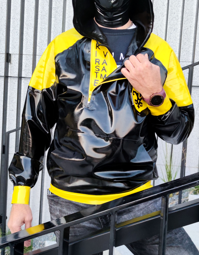 The production combines sewing and glueing technology: the clothesline is glued around the perimeter of the hood. There is a decorative front zipper, revealing Kirsten Vaams logo when opened. The fit is casual and loose, just like a regular fabric sweater. For a custom logo on the back do not hesitate to contact me.