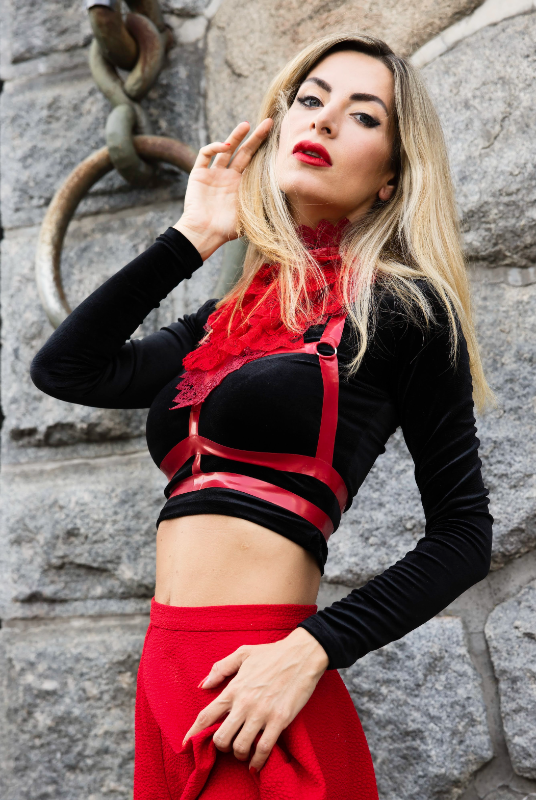 The divine harness with Victorian lace collar and metal rings is an absolute eye-catcher. The combination of latex and textile lace was never as tempting as today!