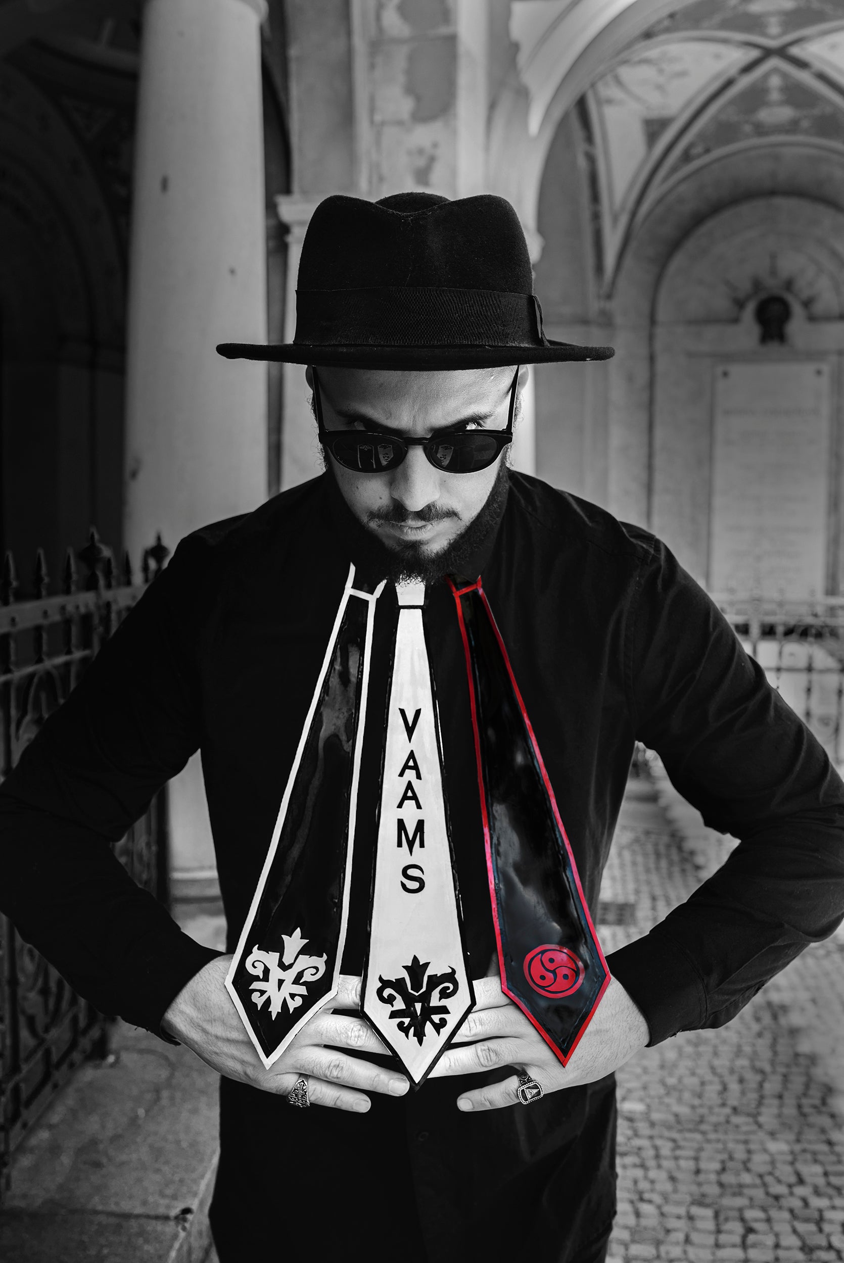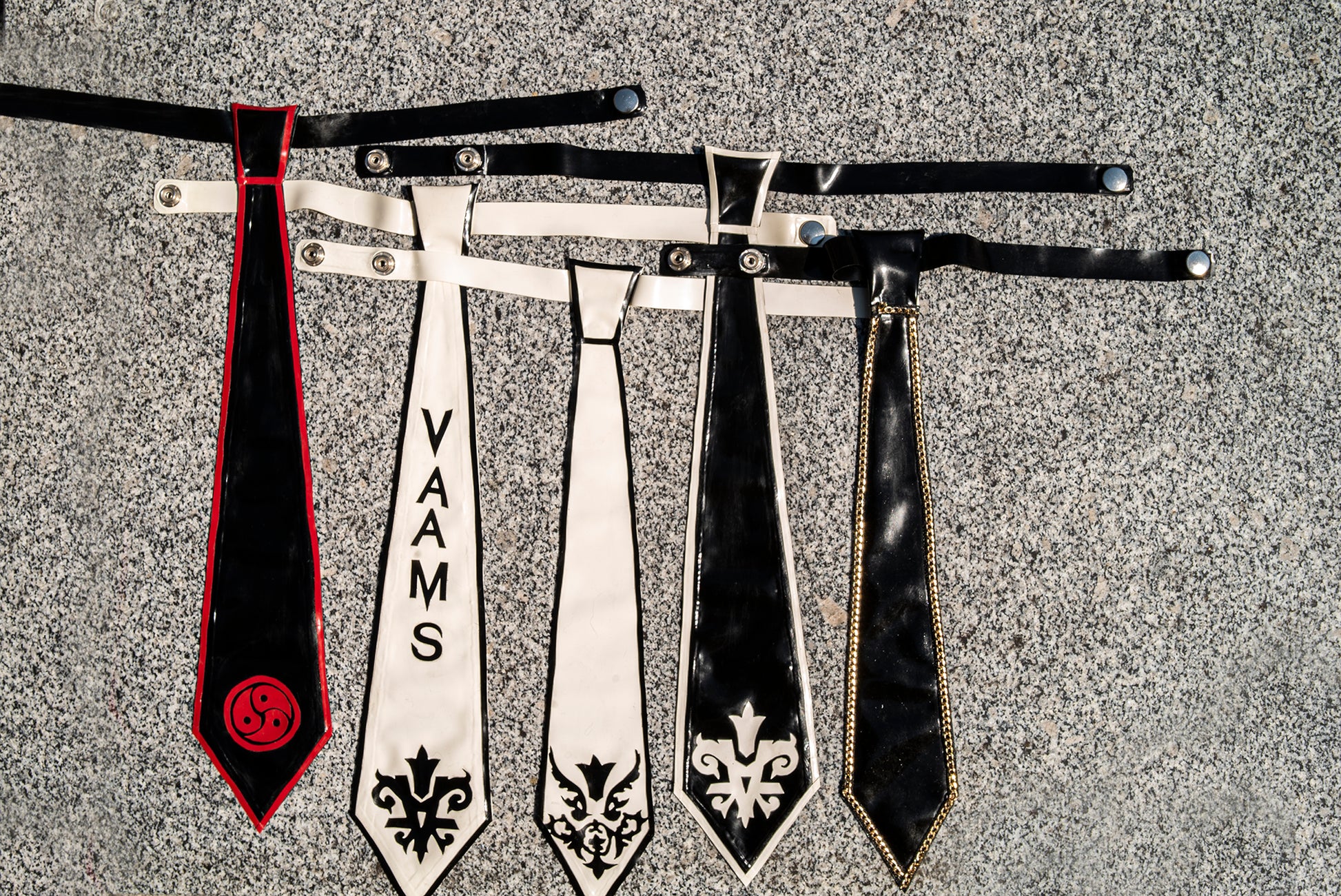 An eccentric yet discreet unisex accessory for both formal and fun events - a very efficient and stylish way to promote your favourite fashion brand! The tie is fastened in the back with two snap buttons, decorated with a black seam and Kirsten Vaams logo.