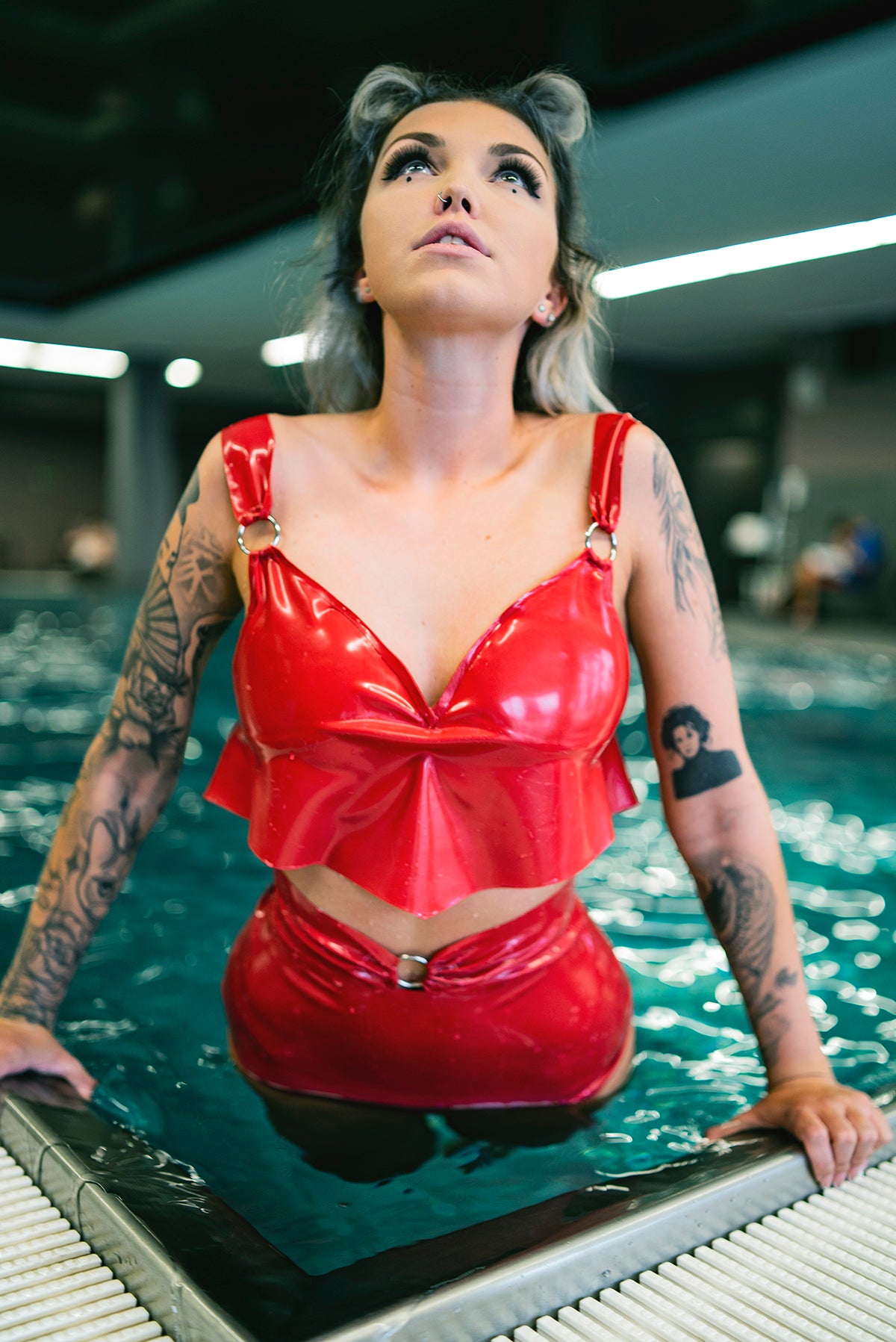Make waves this summer with our chic Two-Piece Latex Swimsuit, crafted for those who desire a blend of elegance and allure at the beach or by the pool. This unique ensemble promises to accentuate your curves while providing a touch of avant-garde sophistication.