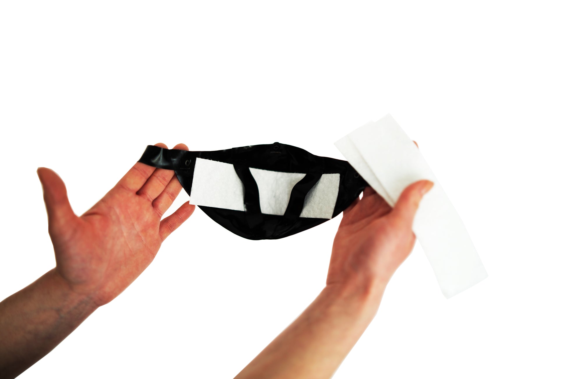 The package also includes three replaceable hygienic filters made from pressed cotton with silica gel microparticles, which absorb moisture from the breath and ventilate through the side holes. Thanks to these filters and the special shape, the mask remains dry and latex does not slip on the face. Simply insert the filter inside the mask. Replace it with a new one when the filter softens and loses its solid shape.