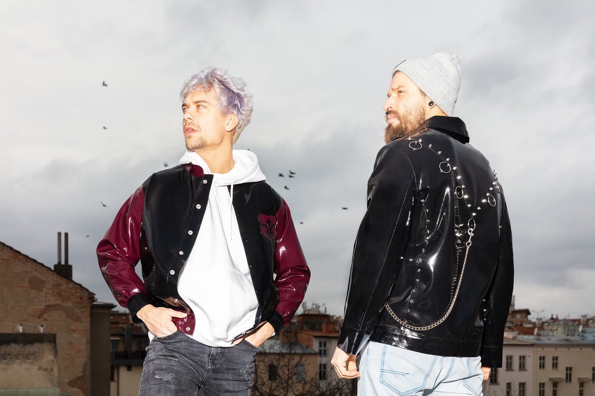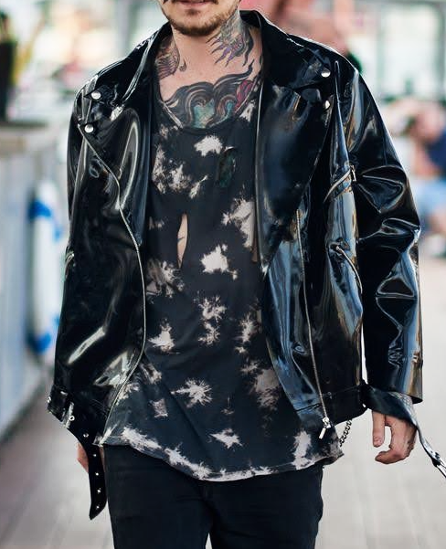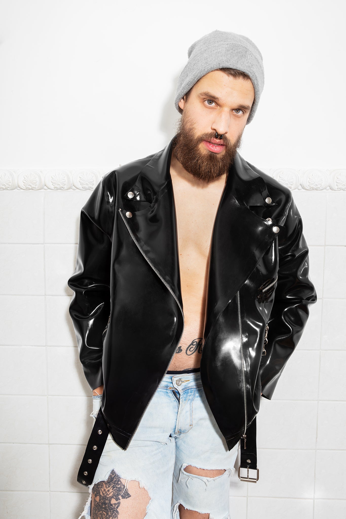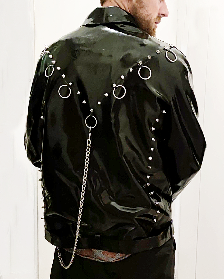 Our latex biker jacket looks stunning in combination with jeans, sweaters or t-shirts. The jacket has three pockets, a zipper and a belt. The back is covered with spikes and O-rings. The whole look is completed with a massive chain with two carabines hanging from the lowest O-ring to the front pocket zipper. Handcrafted in Prague from high-quality latex.