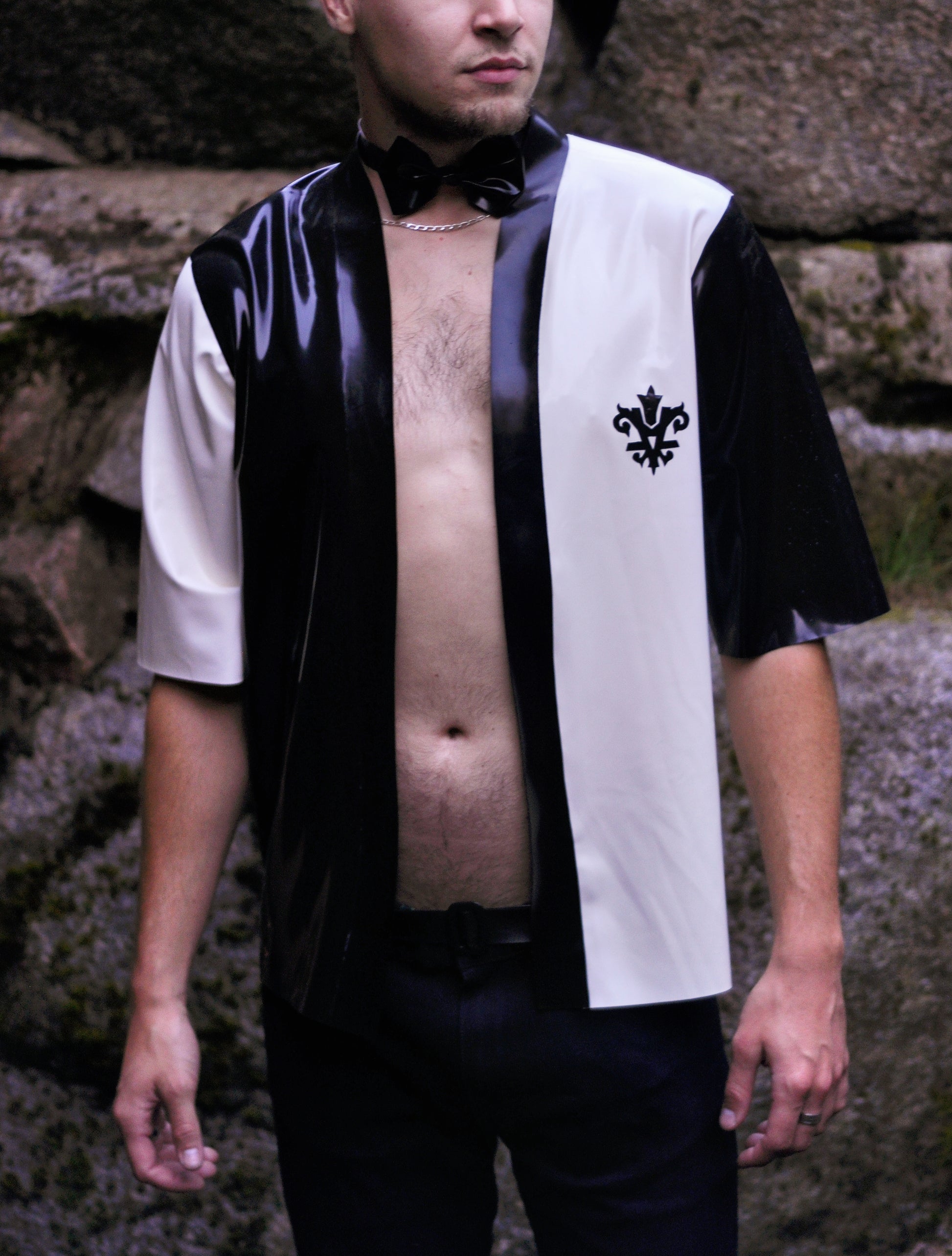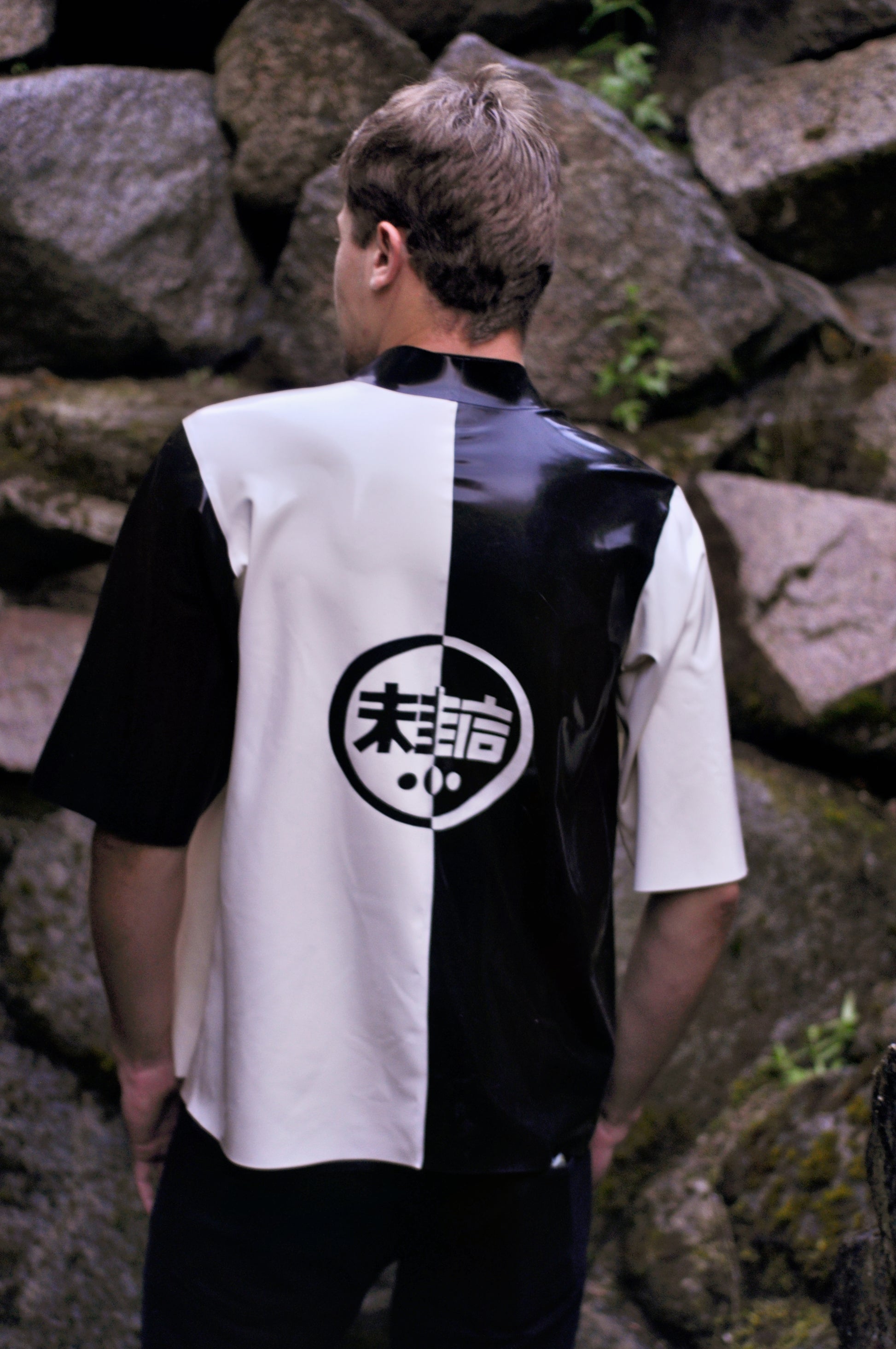 Elevate your style with our striking half-white, half-black men's latex cardigan. Crafted with midi sleeves and adorned with bold Japanese calligraphy on the back that says "Latex is the Future". This piece is designed for modern men who embrace bold fashion and cutting-edge trends. Available in different colours, yet the main colour is black.