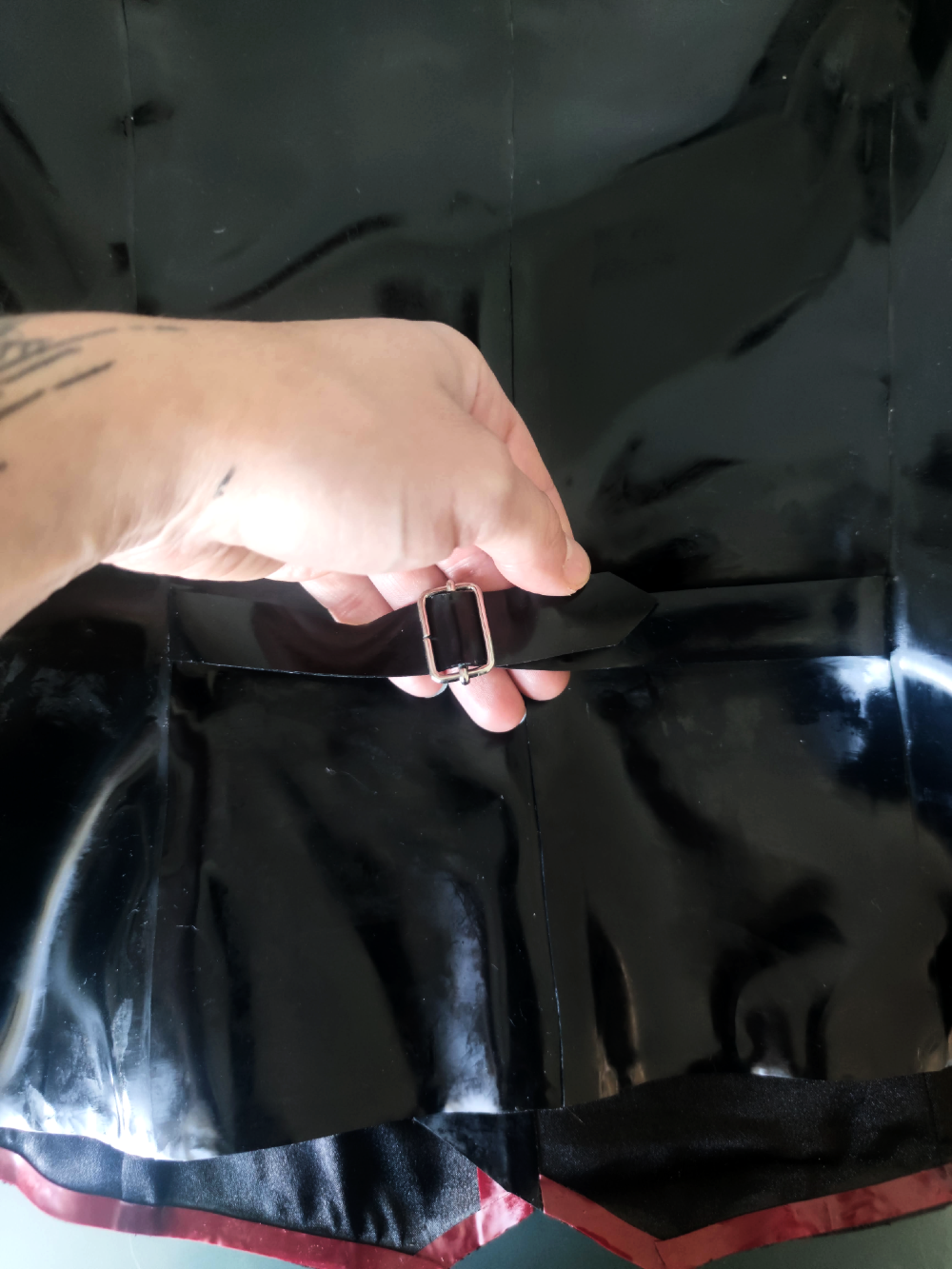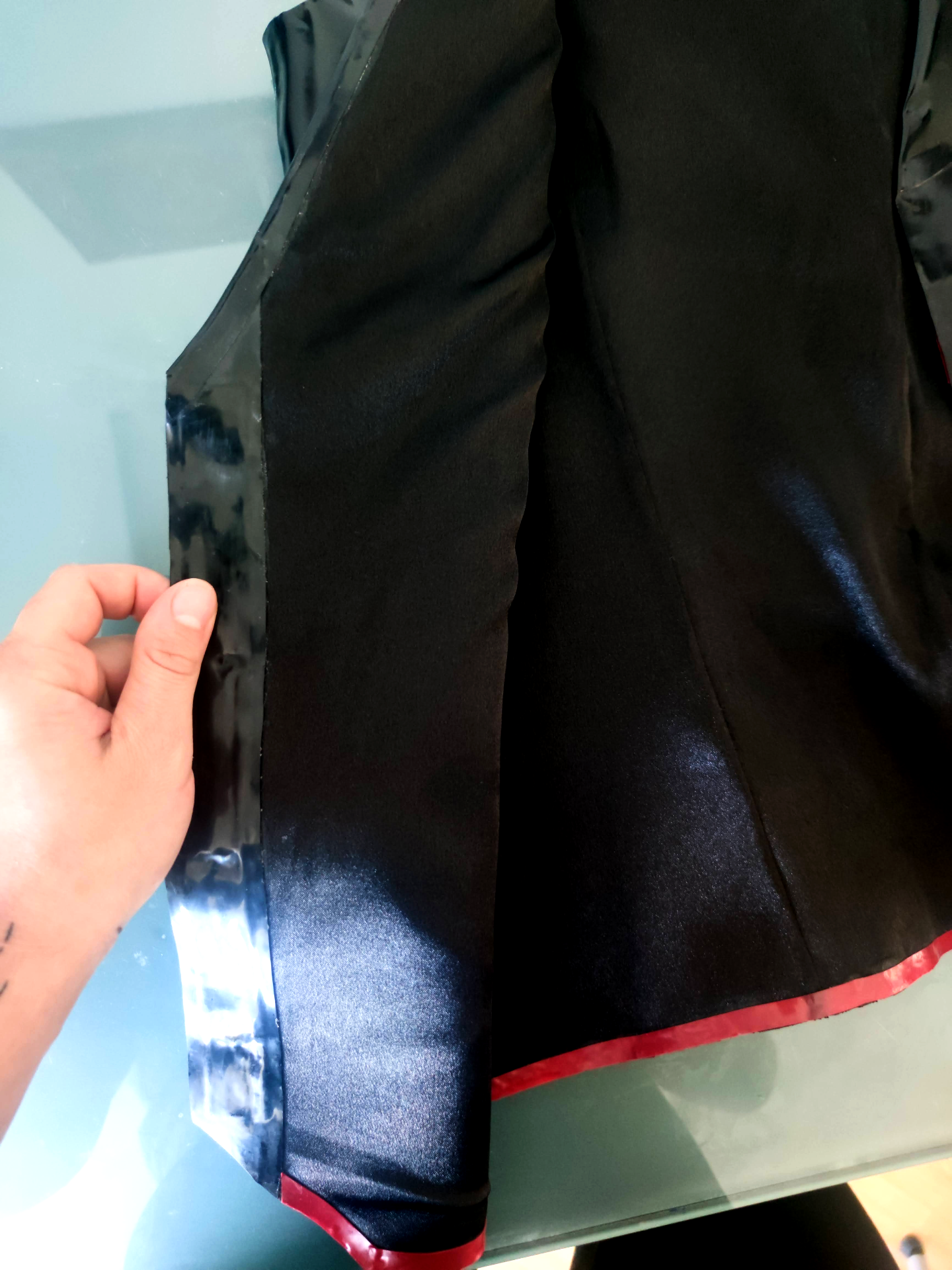 The product pictures show a custom-made order with red hemming; should you prefer a more classic look, worry not – your garment will come with sleek black hemming by default unless otherwise specified in your order notes.