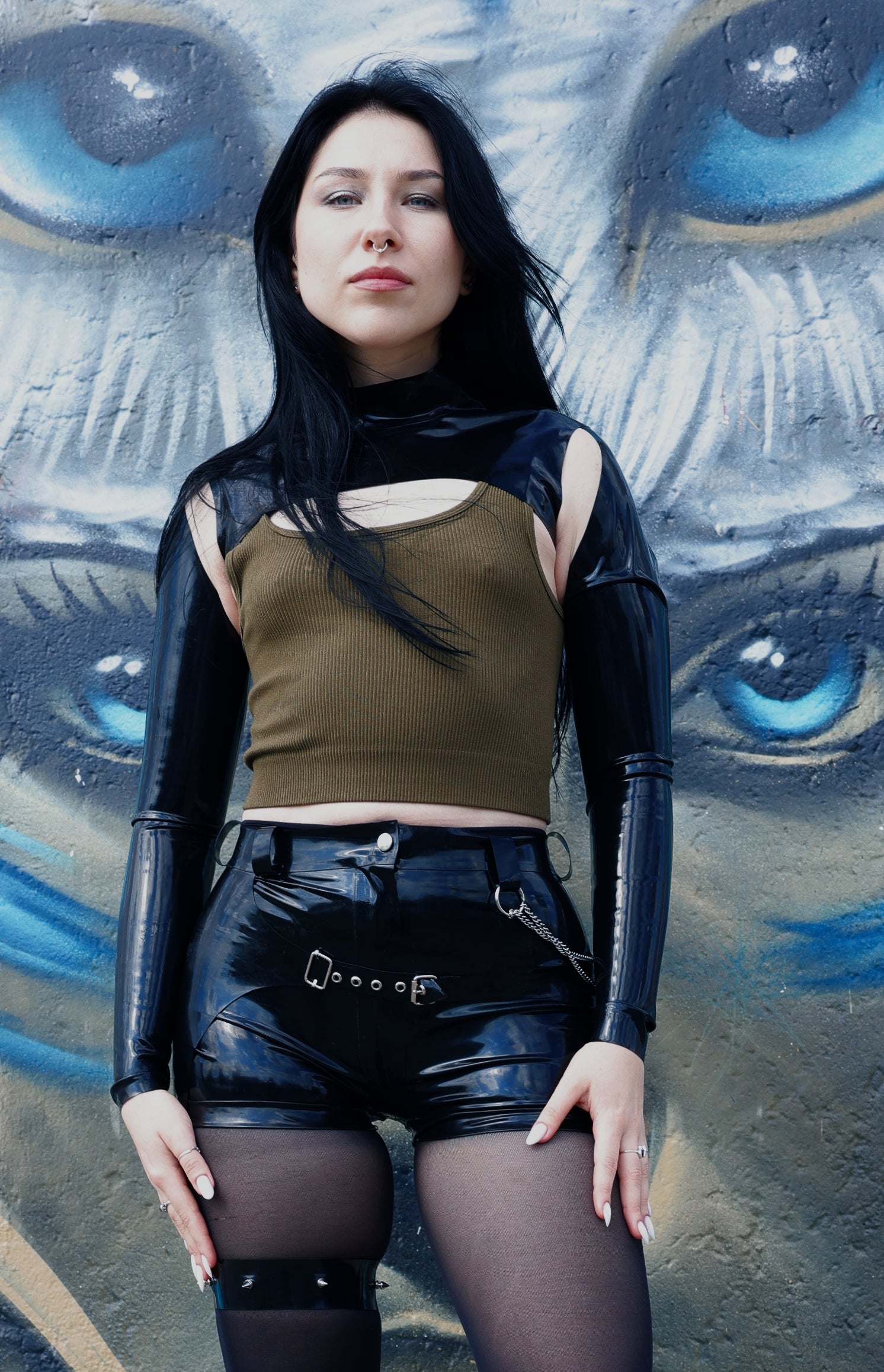A striking latex bolero top designed with dramatic long sleeves and sharp cut out details. The glossy latex finish contrasts beautifully with layered styling, creating a modern look that is both fierce and refined.