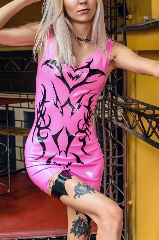 "Quinn" Latex Mini Dress with Tribal Ornaments & Leg Garters