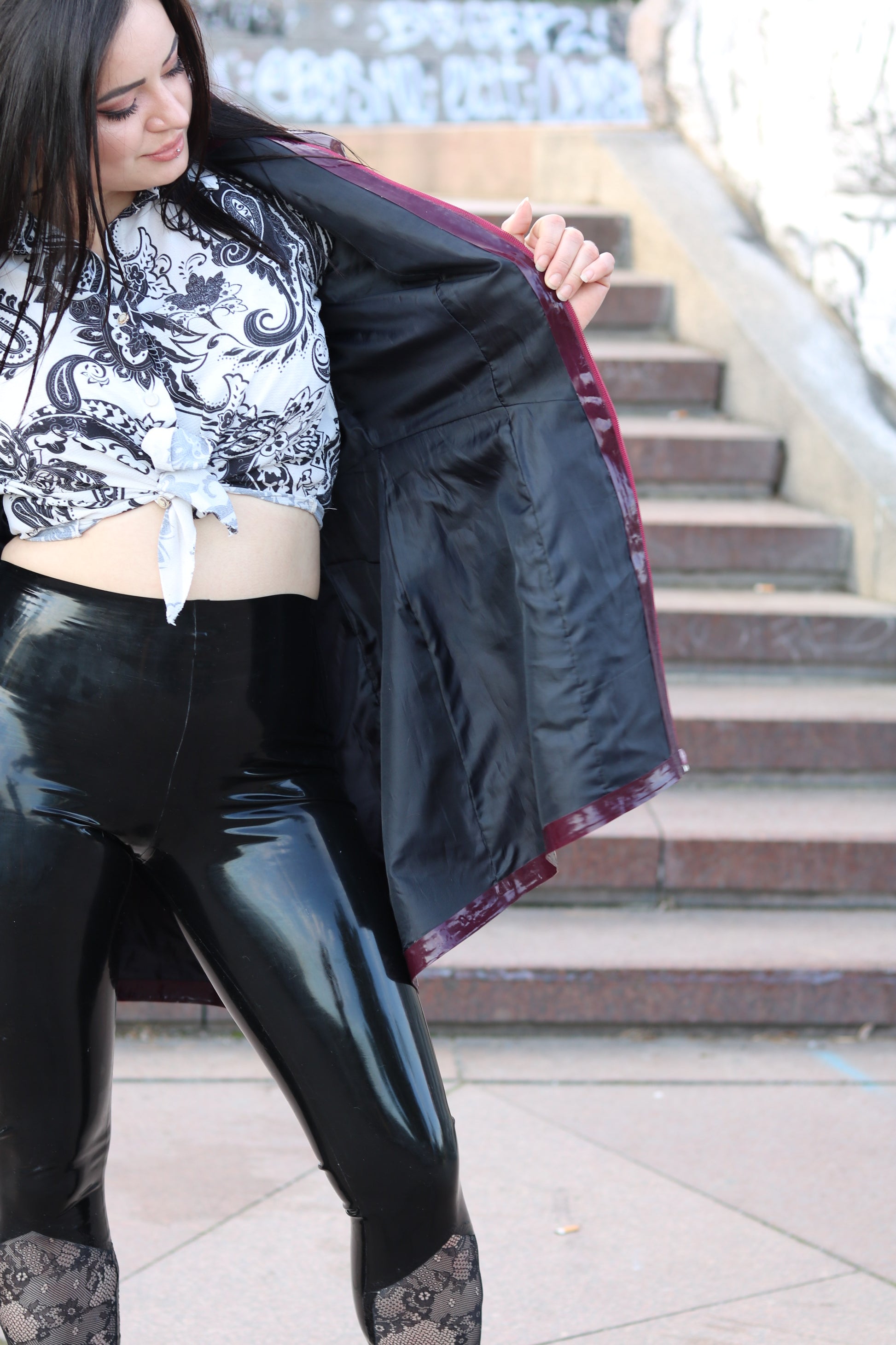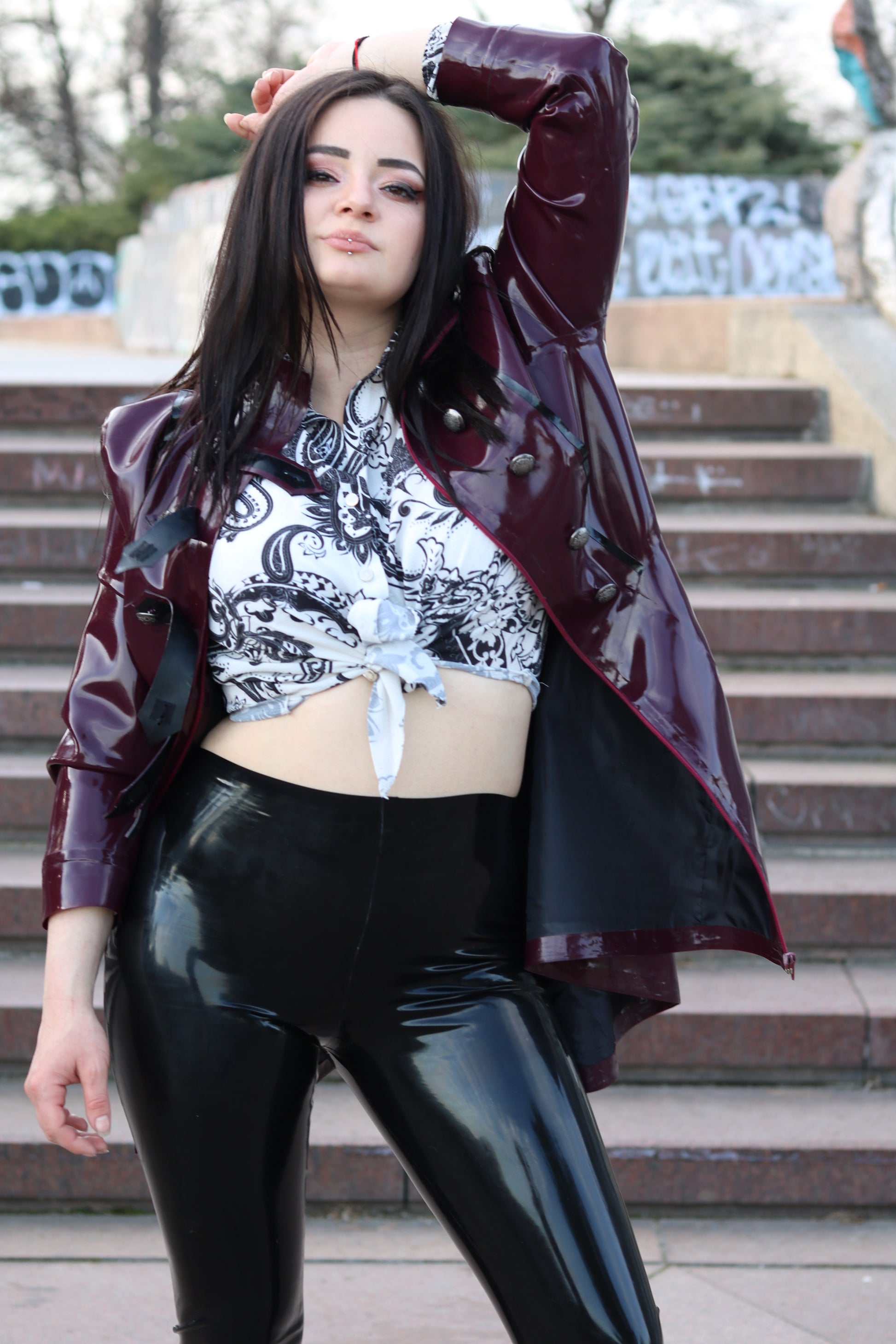 Women's latex military coat is the perfect choice for daily wear no matter if it rains or not! The coat is so comfortable and special due to the fabric lining from the inside that provides the maximum comfort. Looks absolutely stunning in combination with skirts, tights, leggings and high heels.